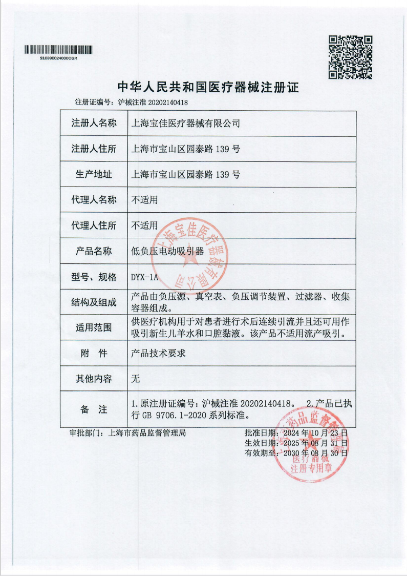 - 极限负压值:18KPa±1.5KPa(135mmHg±11mmHg)