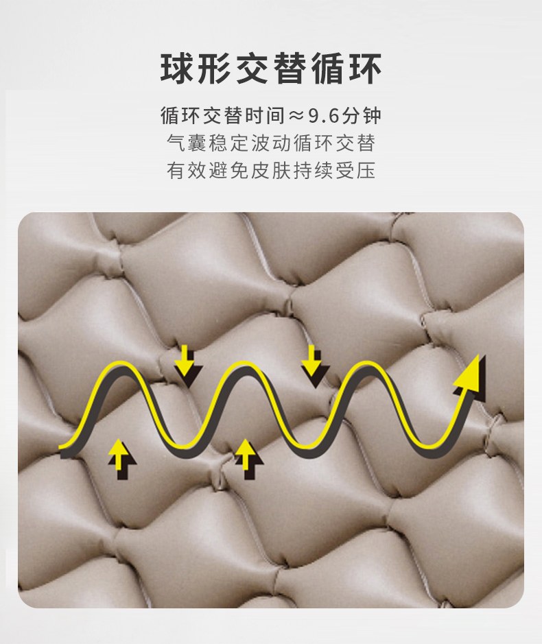- 多球囊交替波动:由医疗级PVC制成,通过气囊的充泄气来改变表面压力,因此可达成压力的重分布