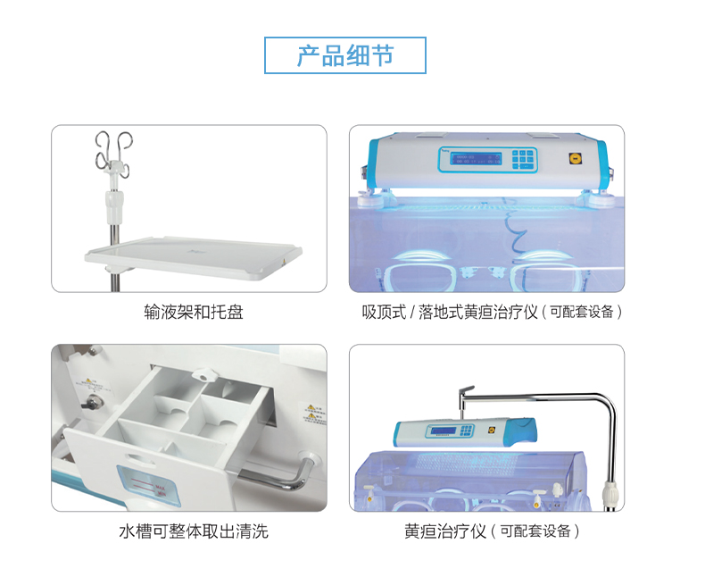 由主机(包括婴儿舱、机箱)、肤温传感器、输液架、托盘和机脚组成。