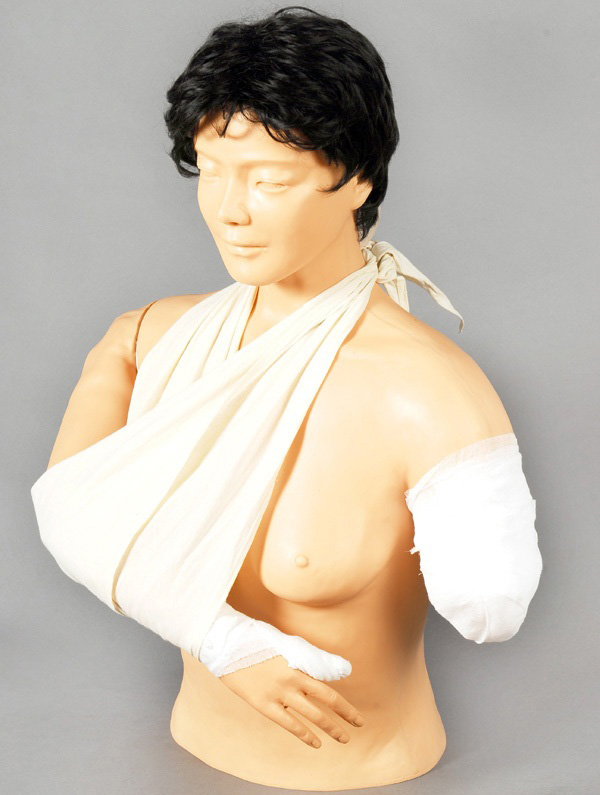 ■ 右臂肩关节、肘关节、腕关节可活动,肘关节可伸展,腕关节可旋转,既可摆成上肢骨折固定位,也可摆成上肢的功能位置,右手食指截指,可练习截指的包扎;左臂为肘上截肢,可进行残肢的包扎;
