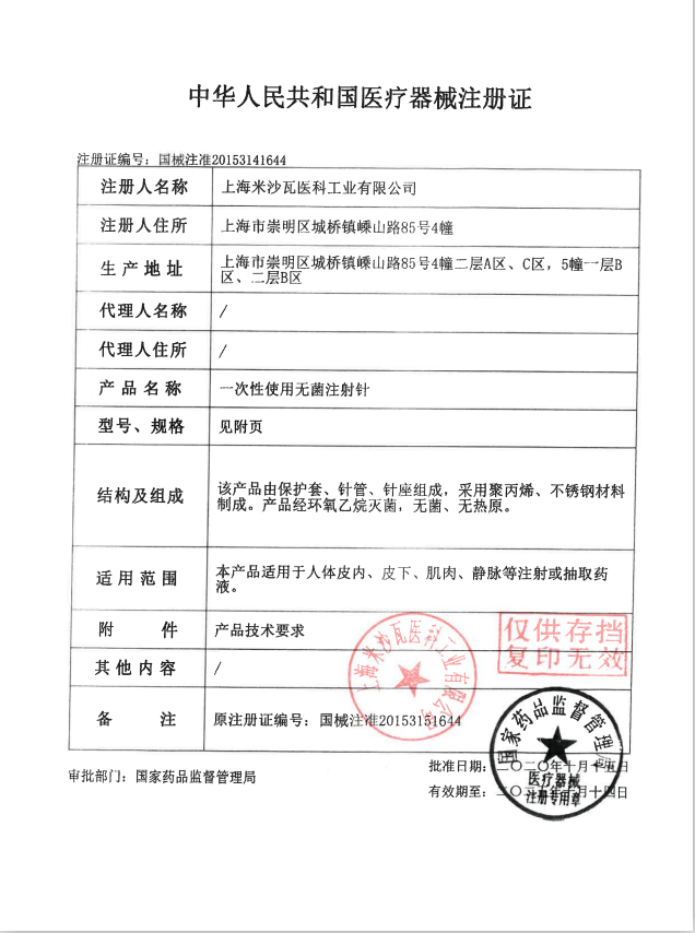 上海米沙瓦医科工业有限公司主要生产和销售各种规格的一次性使用无菌注射针、一次性使用无菌注射器、一次性使用输液器、一次性使用静脉输液针和胰岛素注射器、双联混药包、自毁式注射器等一次性使用的医疗器具和医用穿刺器具。一次性使用无菌注射器,已得到美国FDA确认,取得了(510K)销售证书,产品已销往美国、欧州等发达国家。
