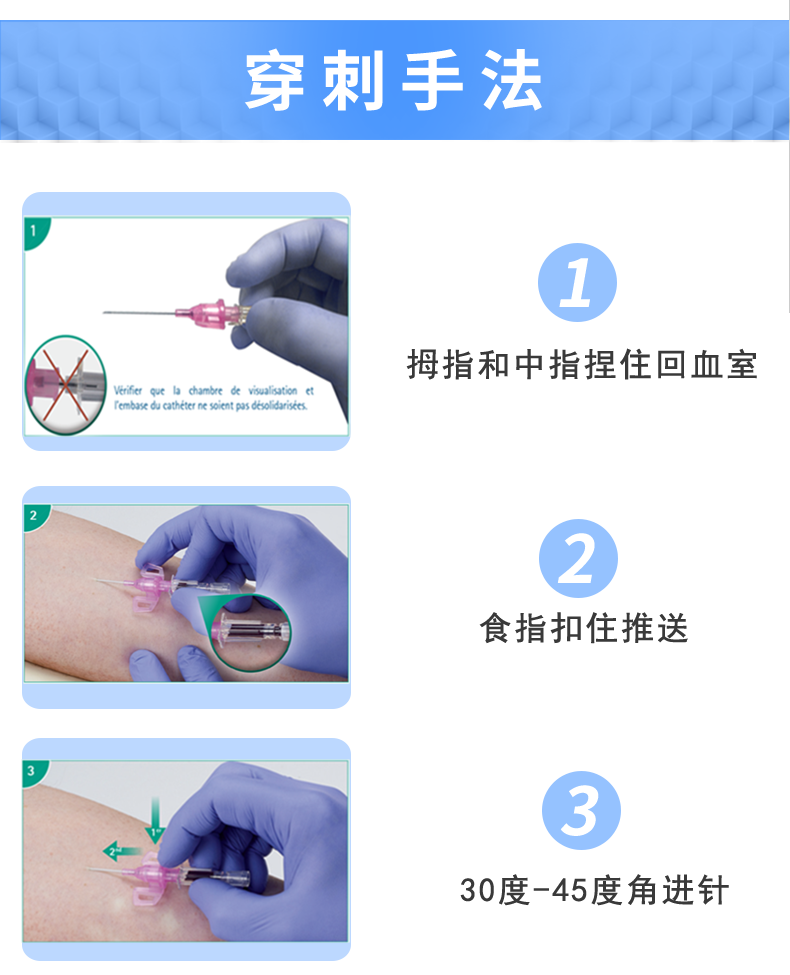 • 拇指和中指固定住。食指推送推送板把导管送入血管
