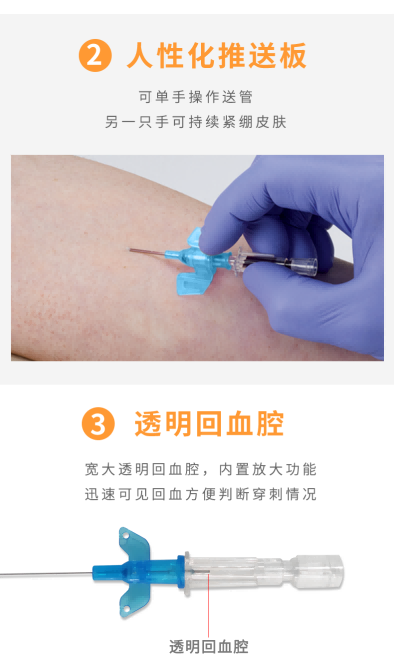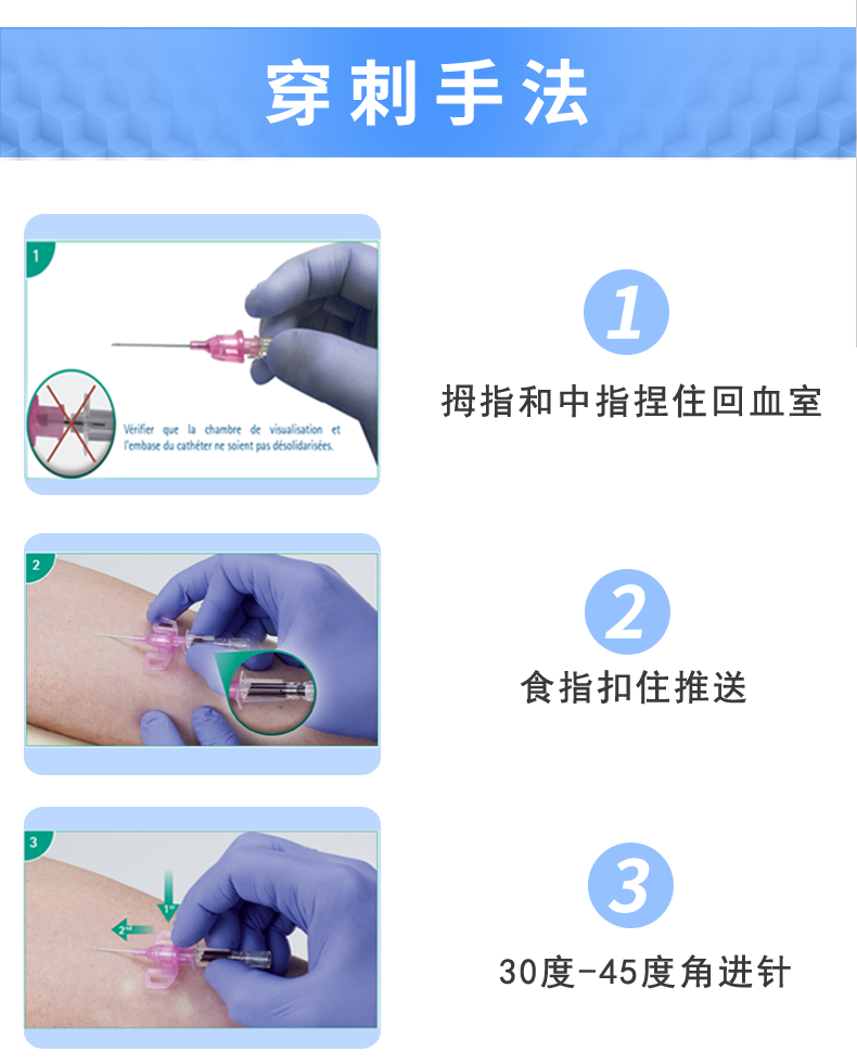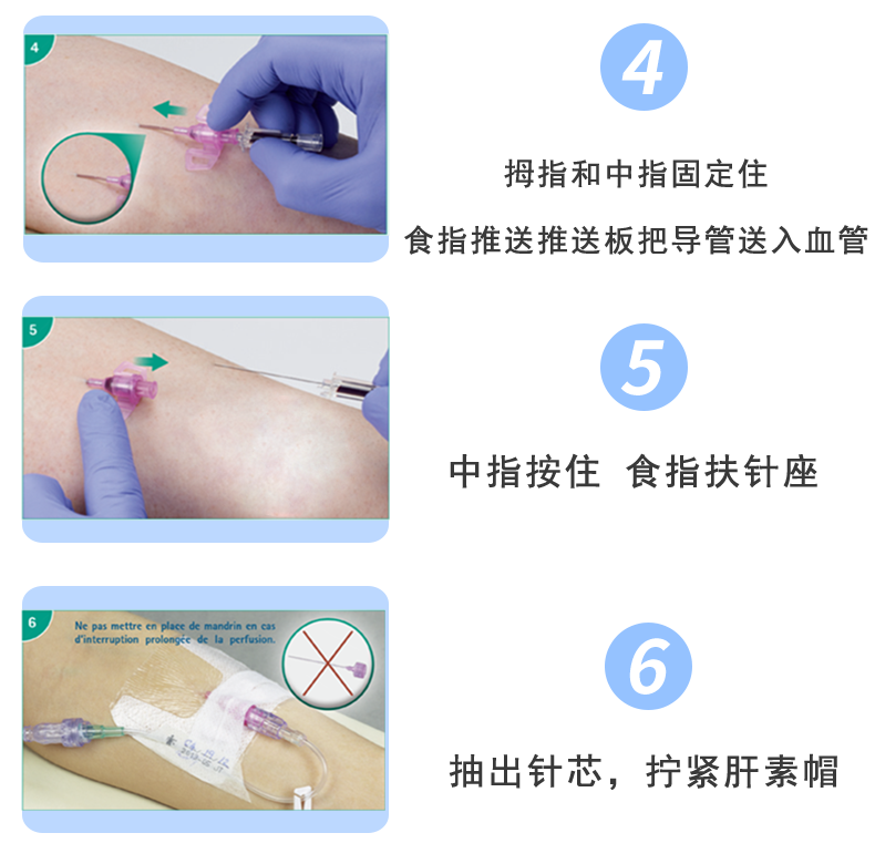 • 拇指和中指固定住。食指推送推送板把导管送入血管