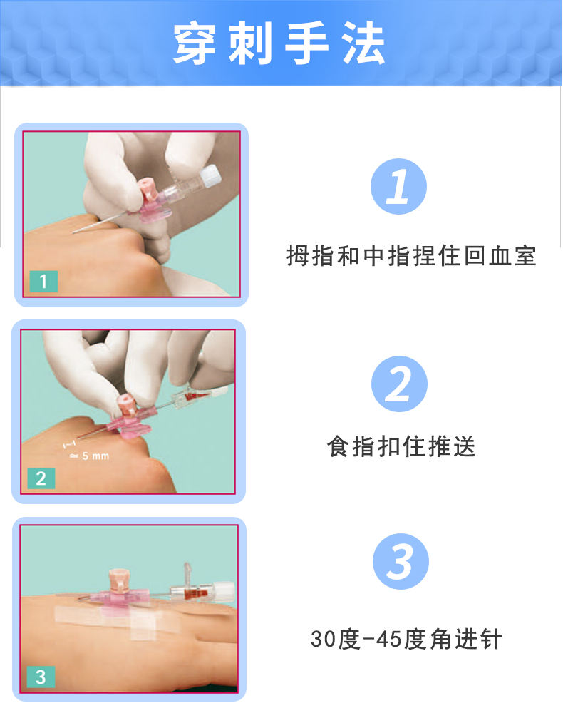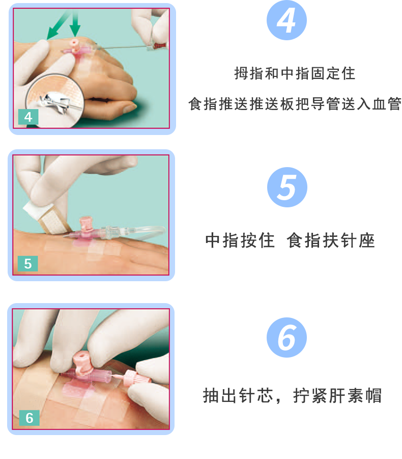 • 拇指和中指固定住。食指推送推送板把导管送入血管