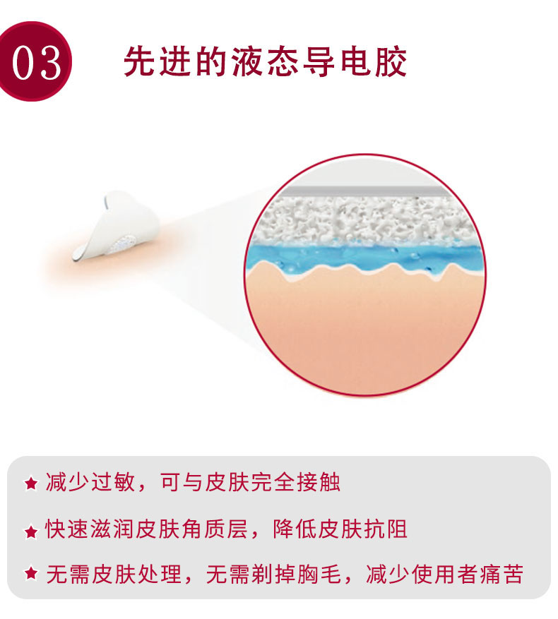 - 湿润导电胶能迅速减少病人的皮肤阻抗(在半小时内,能减少为原阻抗的几百分之一),不需做皮肤处理,对有胸毛的病人,不需要剃掉胸毛。