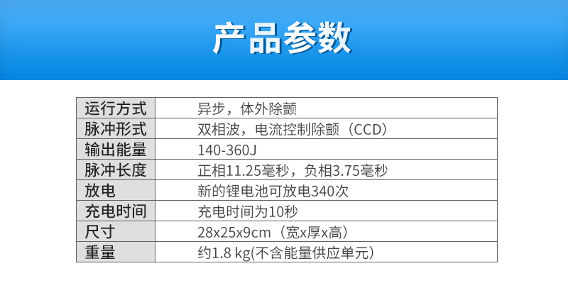 - 输出能量:140-360J(根据病人阻抗自动匹配能量)