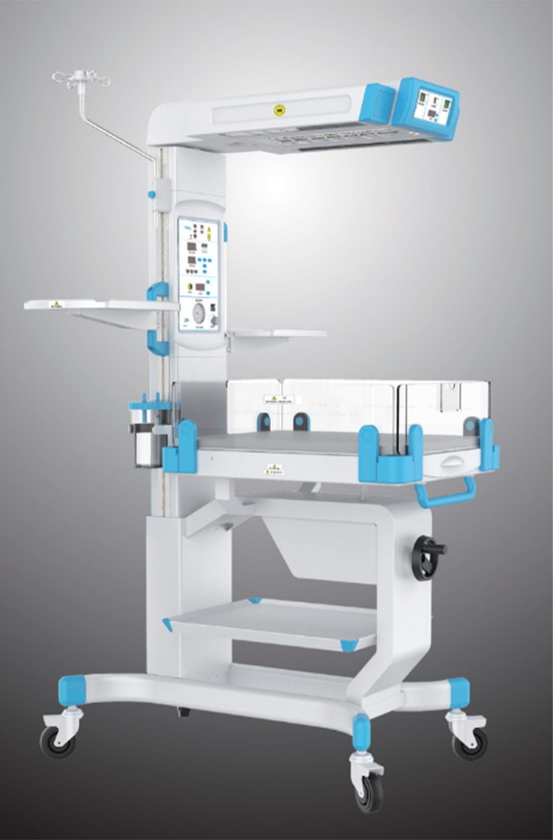由辐射头、控制器、婴儿床架、机脚、皮肤温度传感器、托盘、输液架、光疗灯(选配)组成。