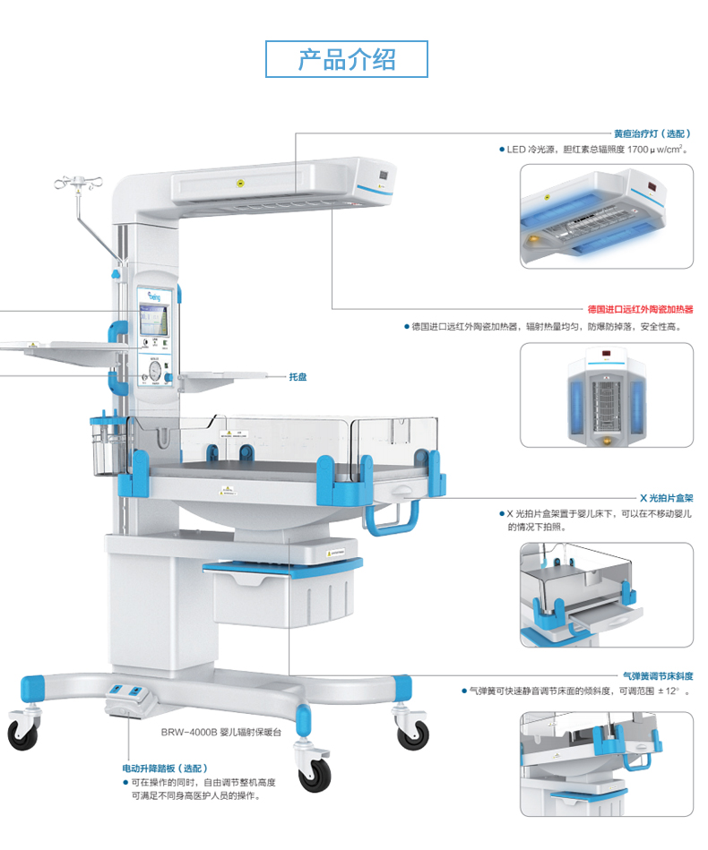 适用于早产儿或病弱儿的培养成长。结构组成由主机(包括婴儿舱、机箱)、集成传感器盒、肤温传感器、照明灯、输液架、托盘和机脚组成。产品特点●LCD液晶触摸屏显示,菜单式操作;●具有箱温和肤温二种温度控制模式;●具有>37℃温度设定功能;●具有湿度控制功能;●双层恒温罩,前后大门可打开;●婴儿床下装有X光拍片盒架;●集成传感器盒,集箱温/肤温/湿度/氧浓度传感器于一体;●独立箱温显示器,独立监视超温报警;●电加湿水槽,可整体取出清洗;●婴儿床倾斜角度无级可调;●具有整机高度调节功能(选配);●装有照明灯,便于检查或晚间观察;●装有输液架和托盘;●具有多种故障报警提示。请联系我们 >>购买贝茵辐射保暖台BRW-4000A(高端款)