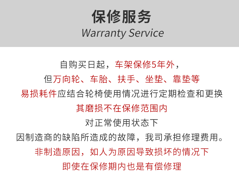 关于保修:自购买日起,除了本体车架保修5年外,其他部分保修1年。对正常使用状态下,因制造商的缺陷所造成的故障,我司承担修理费用。但万向轮、车胎、扶手、坐垫、靠垫等易损耗件应结合轮椅使用情况进行定期检查和更换,其磨损不在保修范围内。(非制造原因,如人为原因导致损坏的情况下,即使在保修期内也是有偿修理)