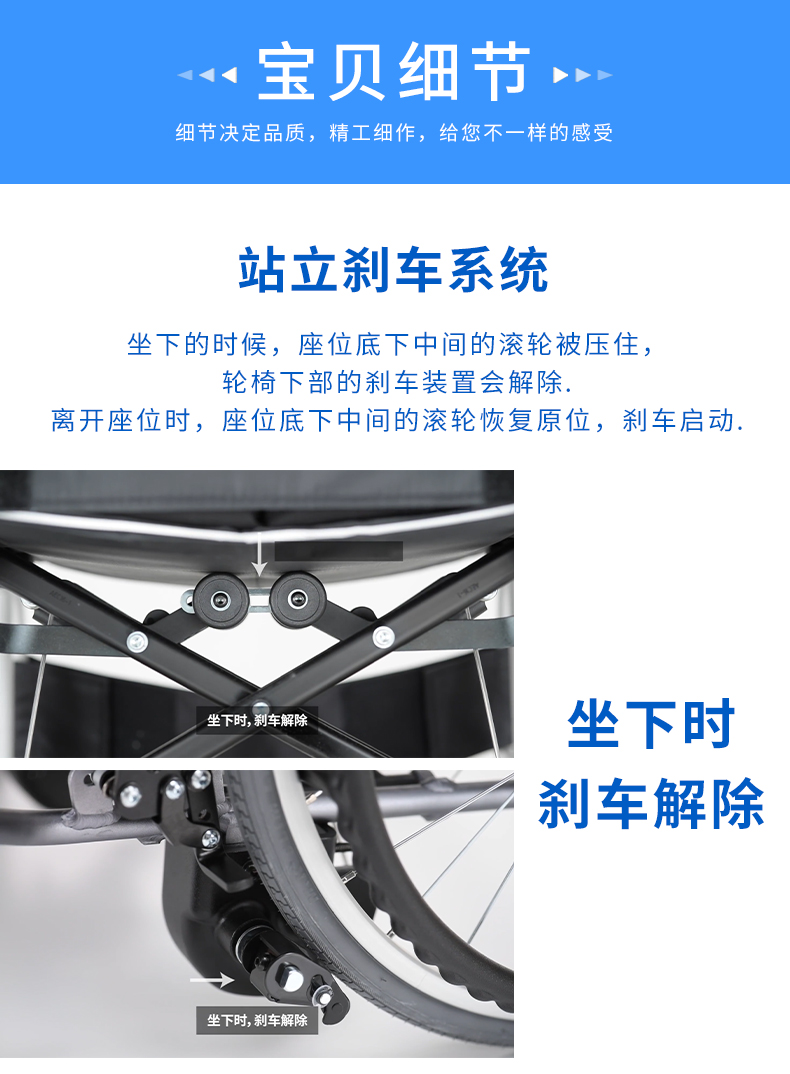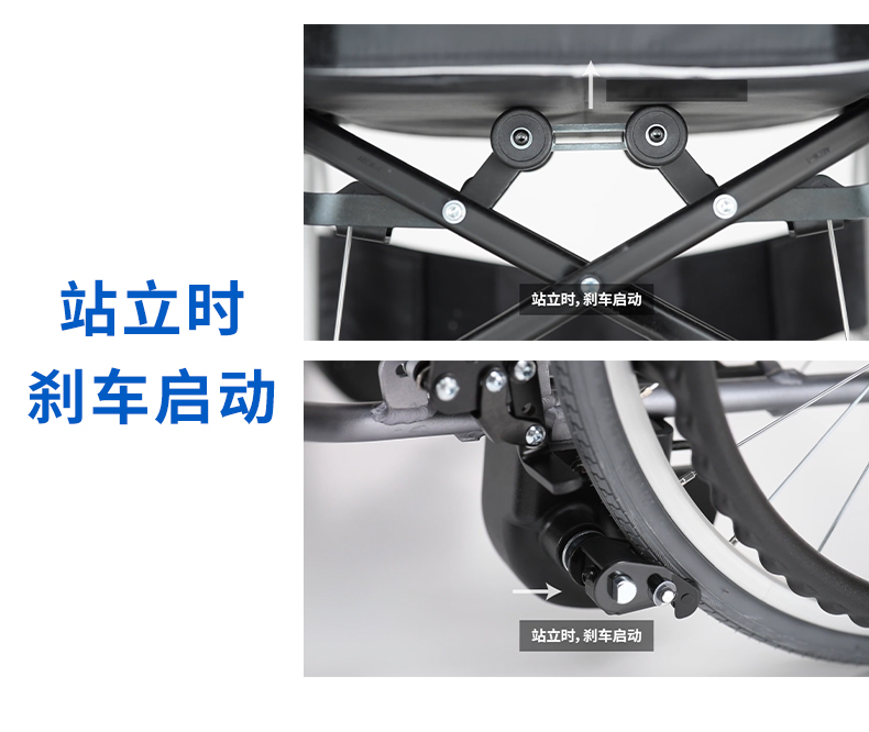 - 站立刹车系统,站立时刹车启动,坐下时刹车解除