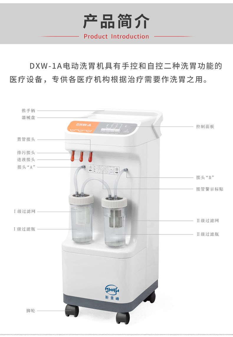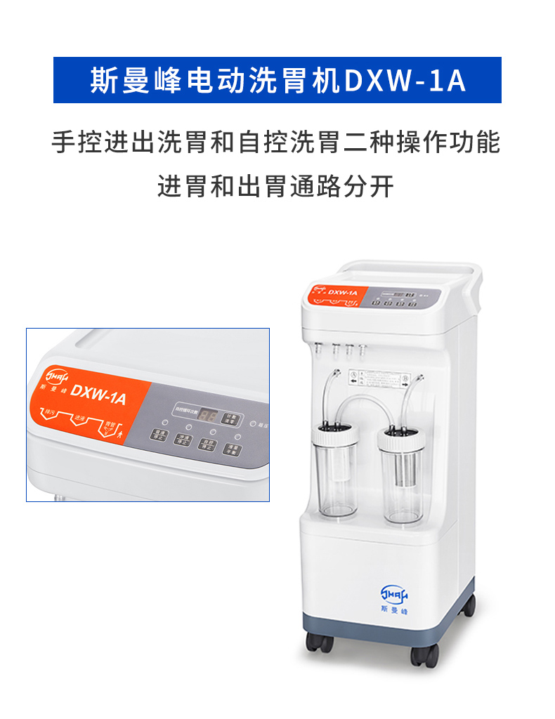 - 斯曼峰DXW-A型电动洗胃机是具有手控和自控二种洗胃功能的医疗设备,专供各医疗机构根据需要作洗胃之用。