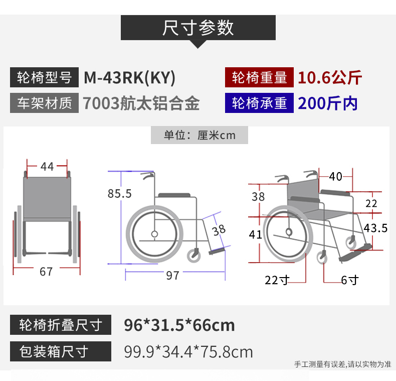 MIKI三贵 手动轮椅车M-43RK 产品参数: